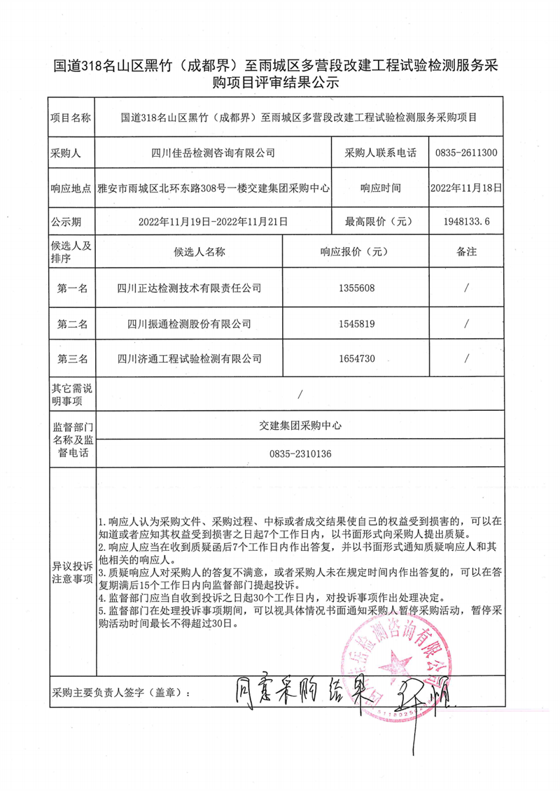 四川佳岳檢測咨詢有限公司國道318名山區(qū)黑竹(成都界)至雨城區(qū)多營段改建工程試驗檢測服務采購項目評審結(jié)果公示