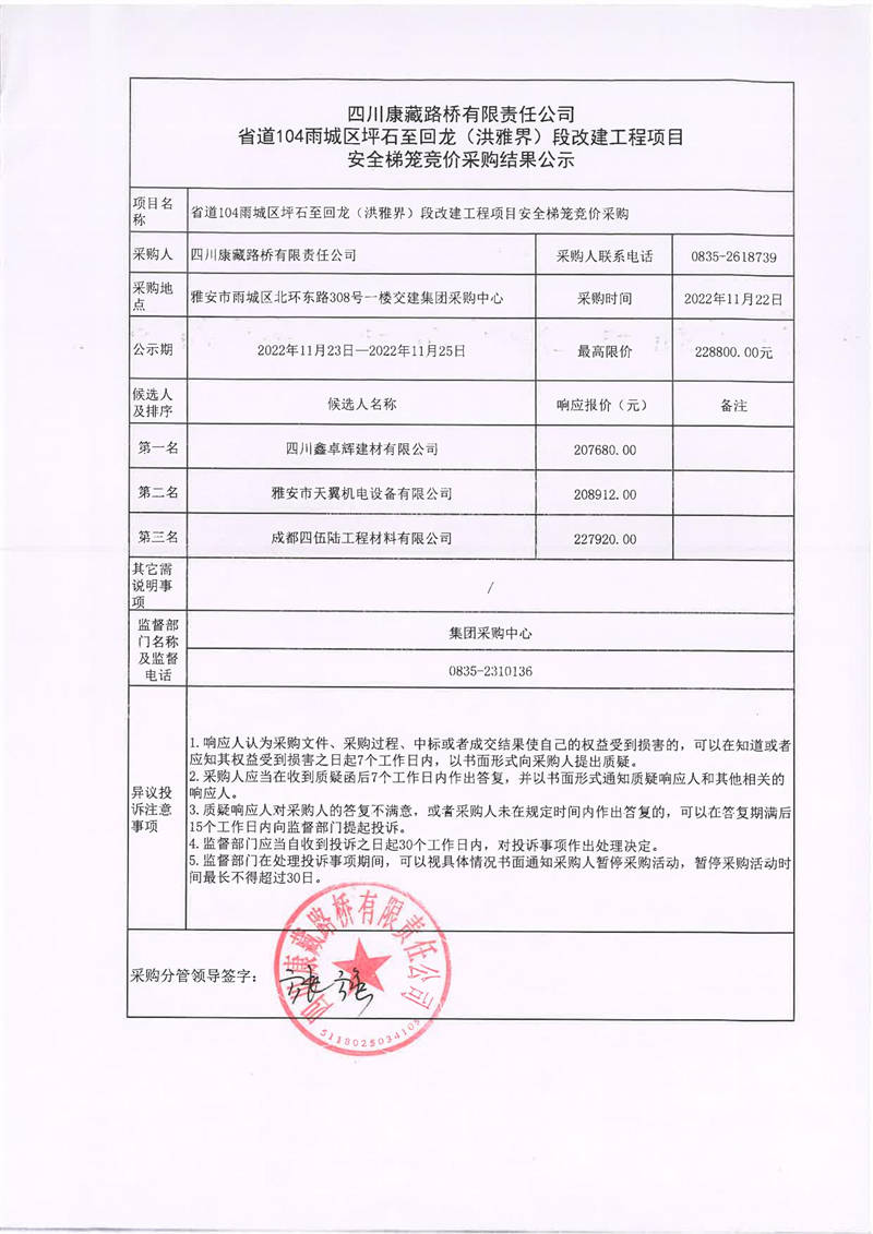 四川康藏路橋有限責任公司省道104雨城區(qū)坪石至回龍(洪雅界)段改建工程項目安全梯籠競價采購結果公示