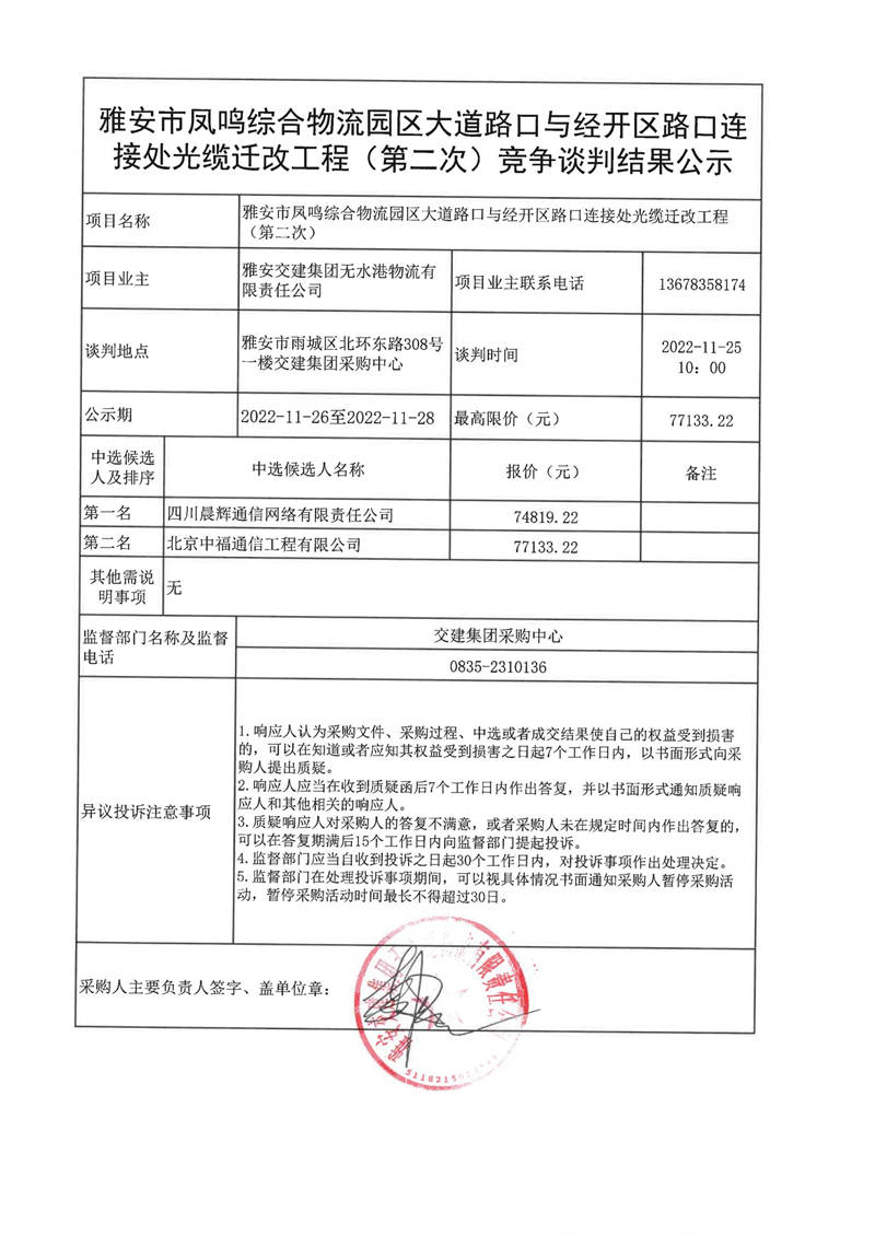 雅安交建集團(tuán)無水港物流有限責(zé)任公司雅安市鳳鳴綜合物流園區(qū)大道路口與經(jīng)開區(qū)路口連接處光纜遷改工程(第二次)競(jìng)爭(zhēng)談判結(jié)果公示