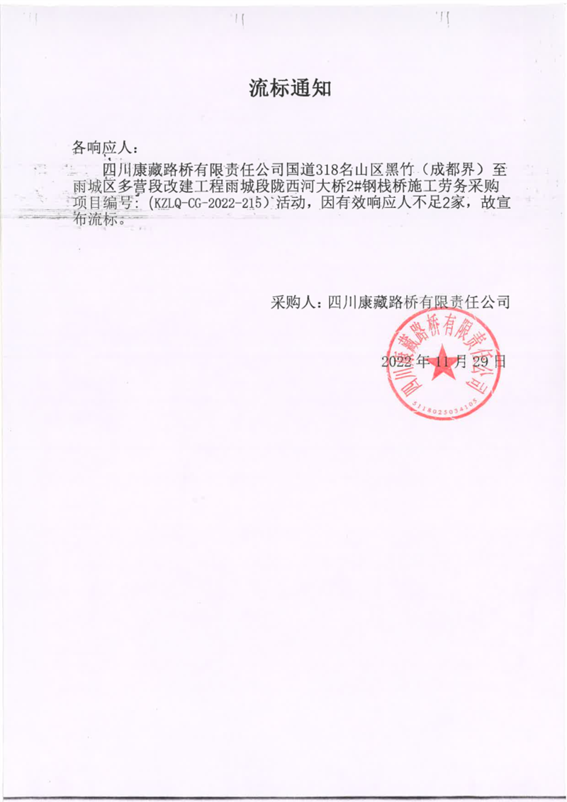 四川康藏路橋有限責任公司國道318名山區(qū)黑竹(成都界)至雨城區(qū)多營段改建工程雨城段隴西河大橋2#鋼棧橋施工勞務采購流標通知