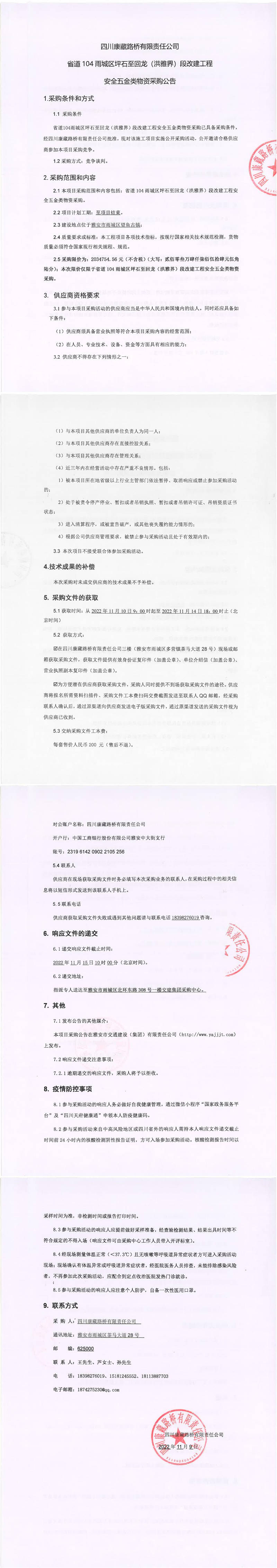 四川康藏路橋有限責(zé)任公司省道104雨城區(qū)坪石至回龍(洪雅界)段改建工程安全五金類物資采購公告