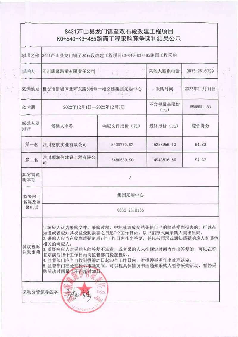 四川康藏路橋有限責(zé)任公司S431蘆山縣龍門鎮(zhèn)至雙石段改建工程項(xiàng)目K0+640-K3+485路面工程采購(gòu)競(jìng)爭(zhēng)談判結(jié)果公示