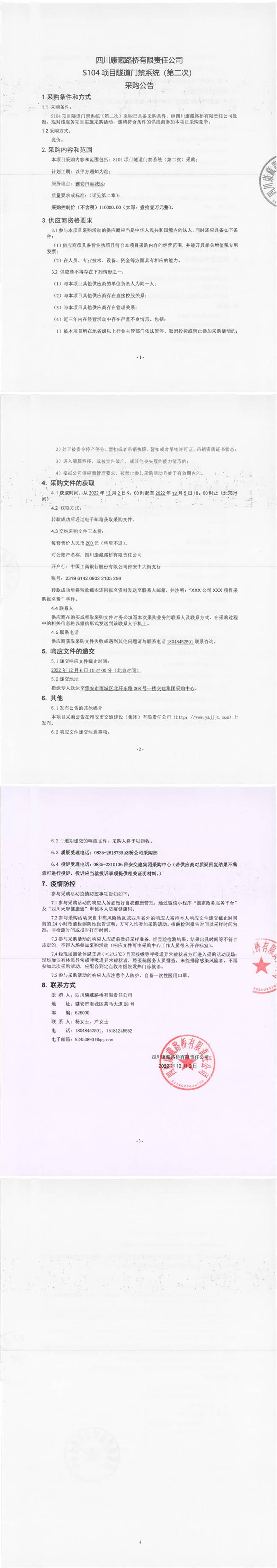 四川康藏路橋有限責任公司S104項目隧道門禁系統(tǒng)(第二次)采購公告