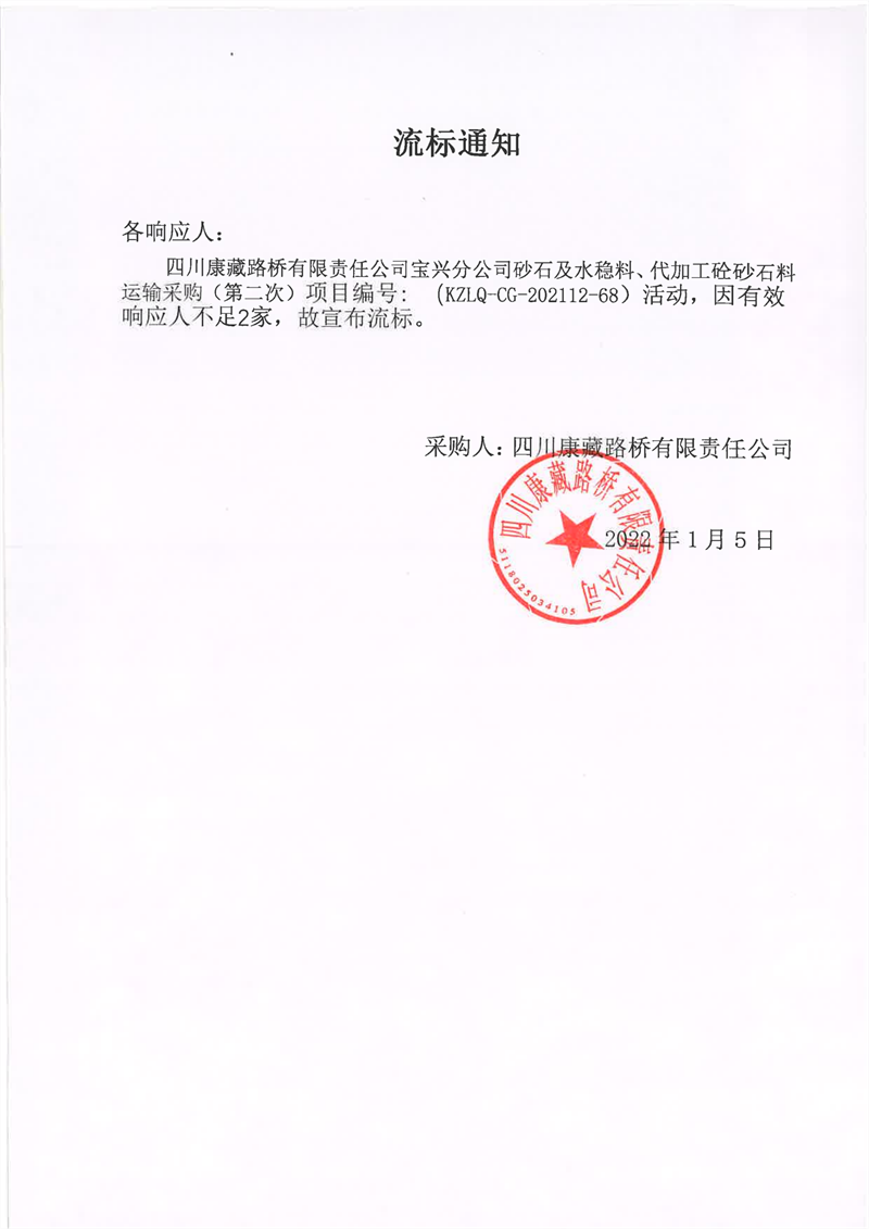四川康藏路橋有限責(zé)任公司寶興分公司砂石及水穩(wěn)料、代加工砼砂石料運(yùn)輸采購(第二次)流標(biāo)通知