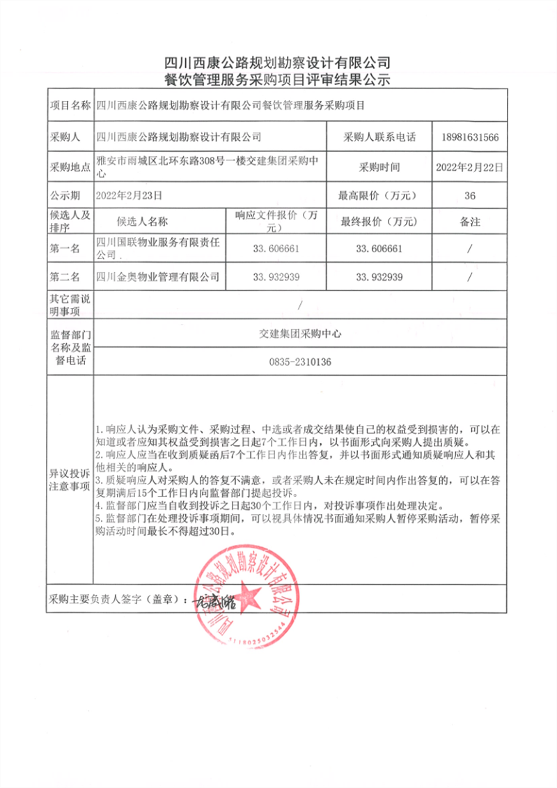 四川西康公路規(guī)劃勘察設(shè)計有限公司餐飲管理服務(wù)采購項目評審結(jié)果公示