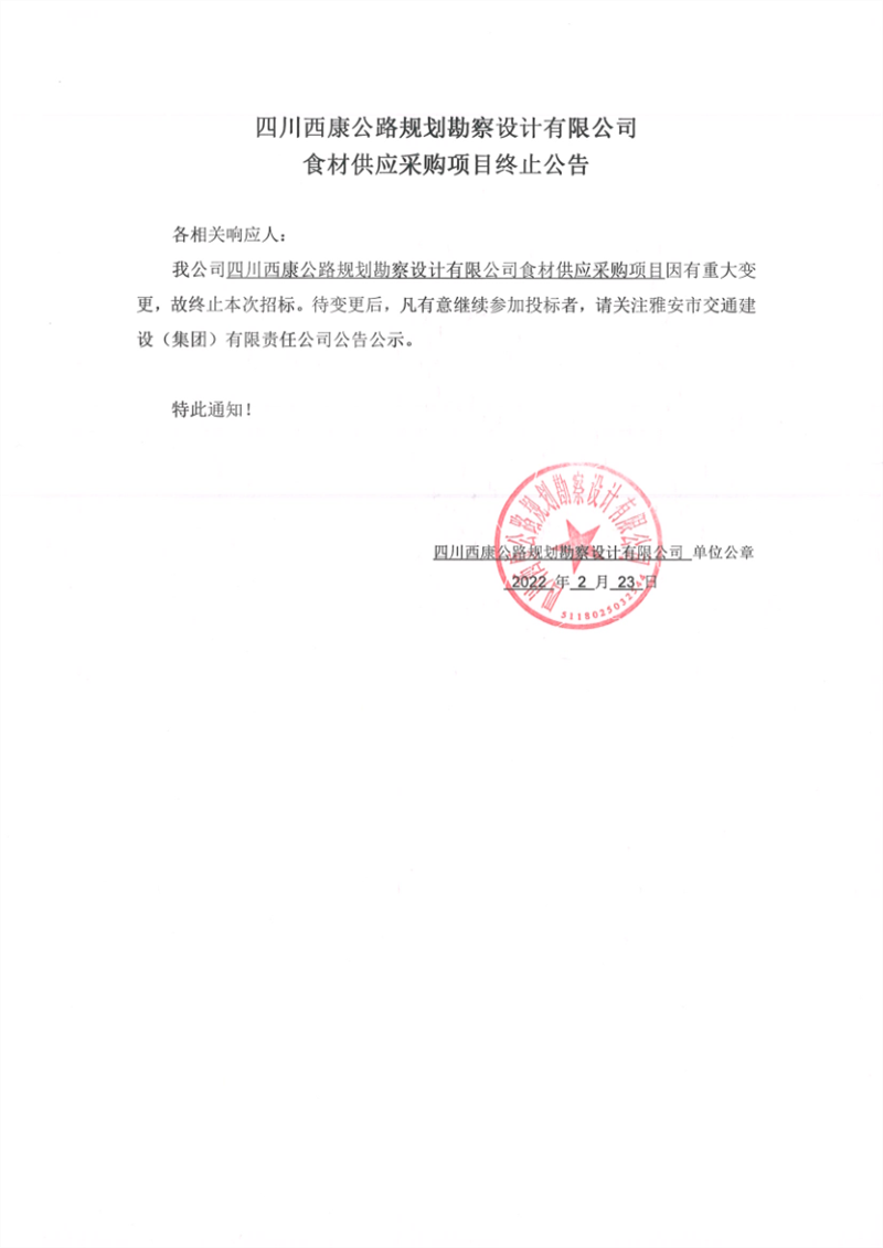 四川西康公路規(guī)劃勘察設(shè)計(jì)有限公司食材供應(yīng)采購(gòu)項(xiàng)目終止公告