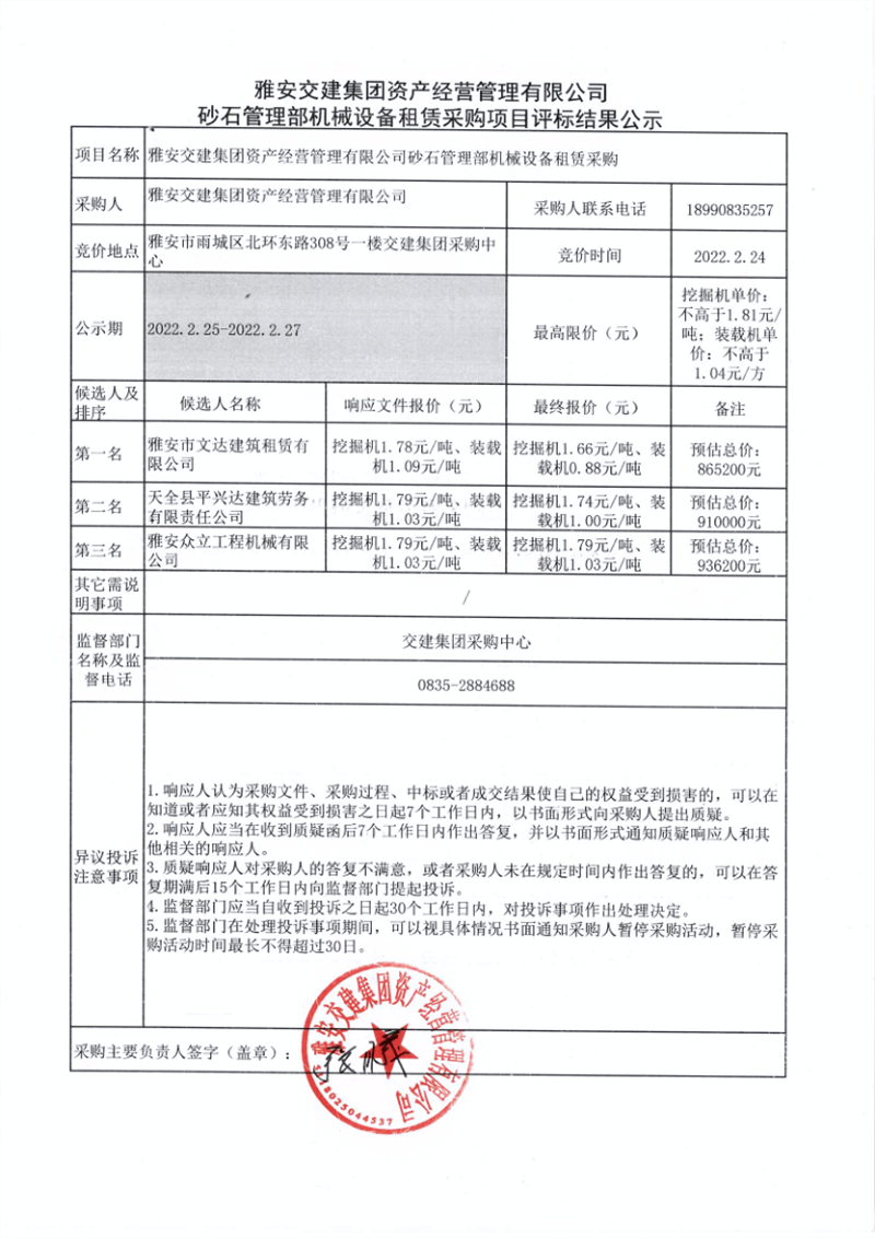 雅安交建集團資產經營管理有限公司砂石管理部機械設備租賃采購項目評標結果公示