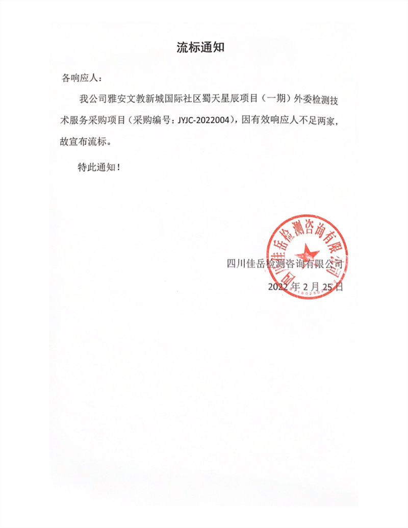 四川佳岳檢測咨詢有限公司雅安文教新城國際社區(qū)蜀天星辰項目(一期)外委檢測服務采購項目流標通知