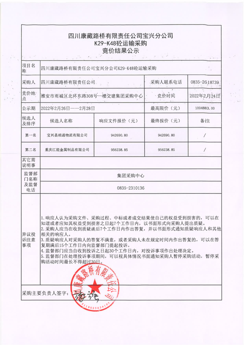 四川康藏路橋有限責(zé)任公司寶興分公司K29-K48砼運(yùn)輸采購競價結(jié)果公示