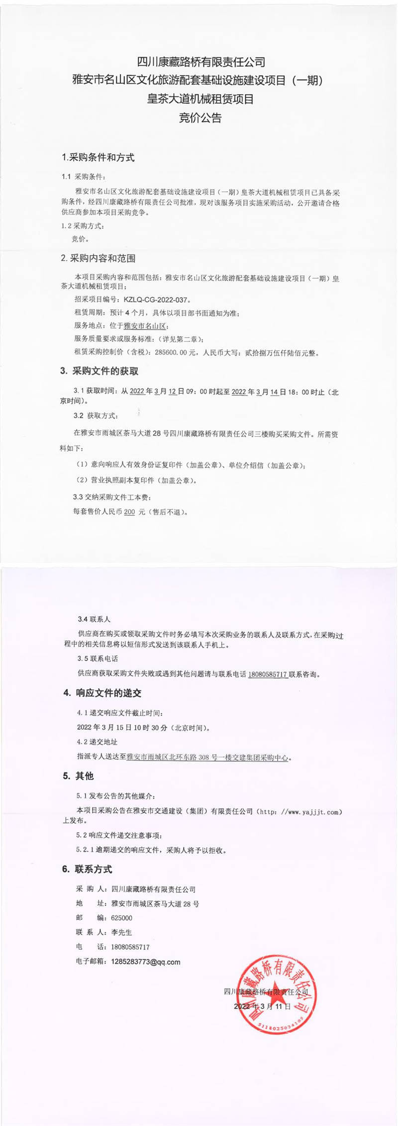 四川康藏路橋有限責(zé)任公司雅安市名山區(qū)文化旅游配套基礎(chǔ)設(shè)施建設(shè)項(xiàng)目(一期)皇茶大道機(jī)械租賃項(xiàng)目競(jìng)價(jià)公告