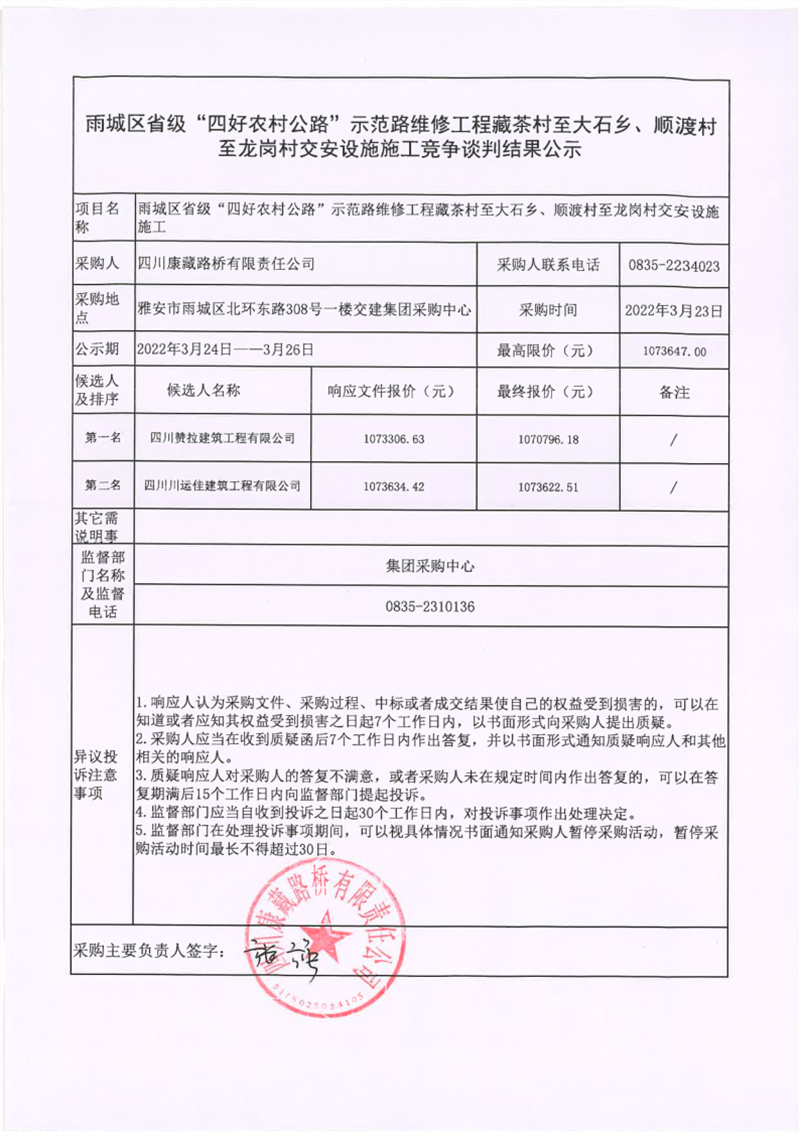 四川康藏路橋有限責任公司雨城區(qū)省級“四好農(nóng)村公路”示范路維修工程藏茶村至大石鄉(xiāng)、順渡村至龍崗村交安設施施工競爭談判結(jié)果公示