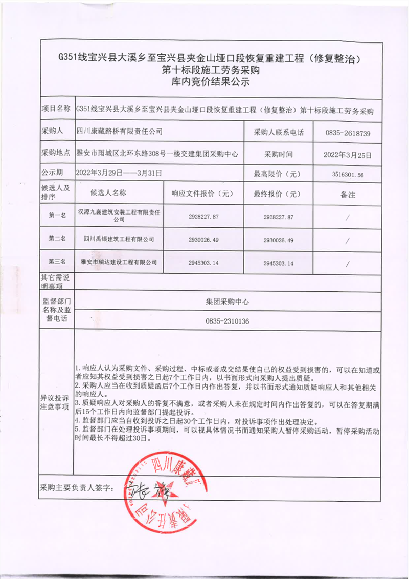 四川康藏路橋有限責(zé)任公司寶興分公司G351線寶興縣大溪鄉(xiāng)至寶興縣夾金山埡口段恢復(fù)重建工程(修復(fù)整治)第十標段施工勞務(wù)采購庫內(nèi)競價結(jié)果公示