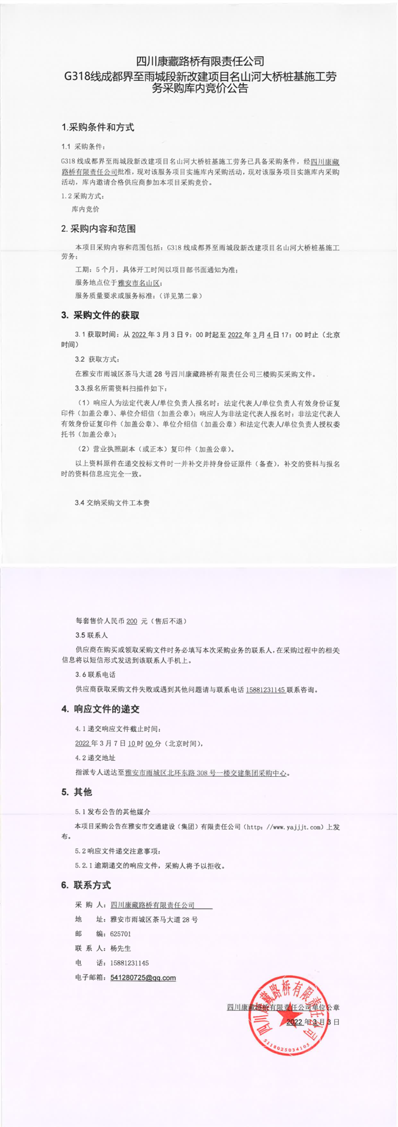 四川康藏路橋有限責(zé)任公司G318線成都界至雨城段新改建項(xiàng)目名山河大橋樁基施工勞務(wù)采購庫內(nèi)競(jìng)價(jià)公告
