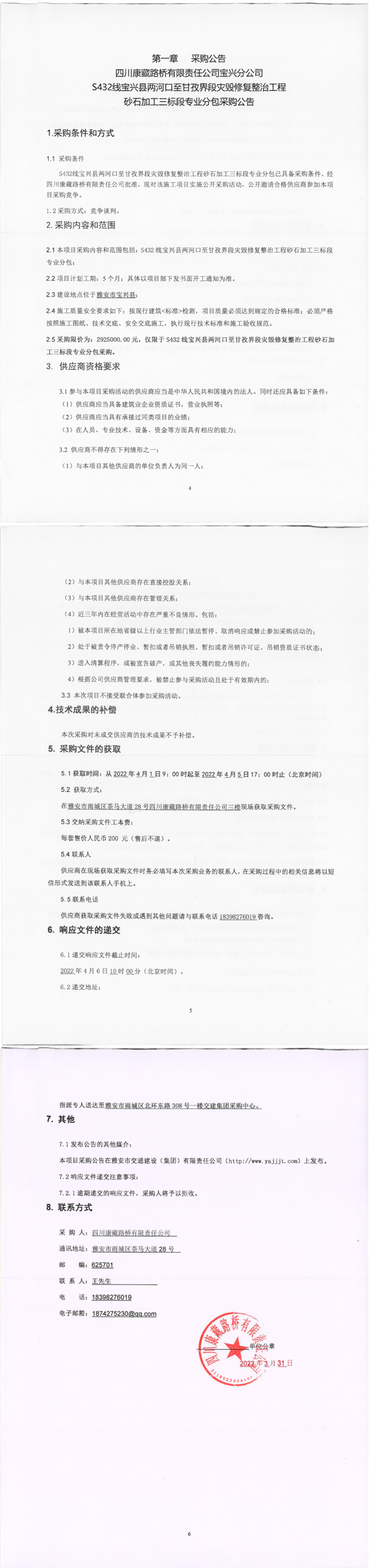 四川康藏路橋有限責(zé)任公司S432線寶興縣兩河口至甘孜界段災(zāi)毀修復(fù)整治工程砂石加工三標(biāo)段專(zhuān)業(yè)分包采購(gòu)公告