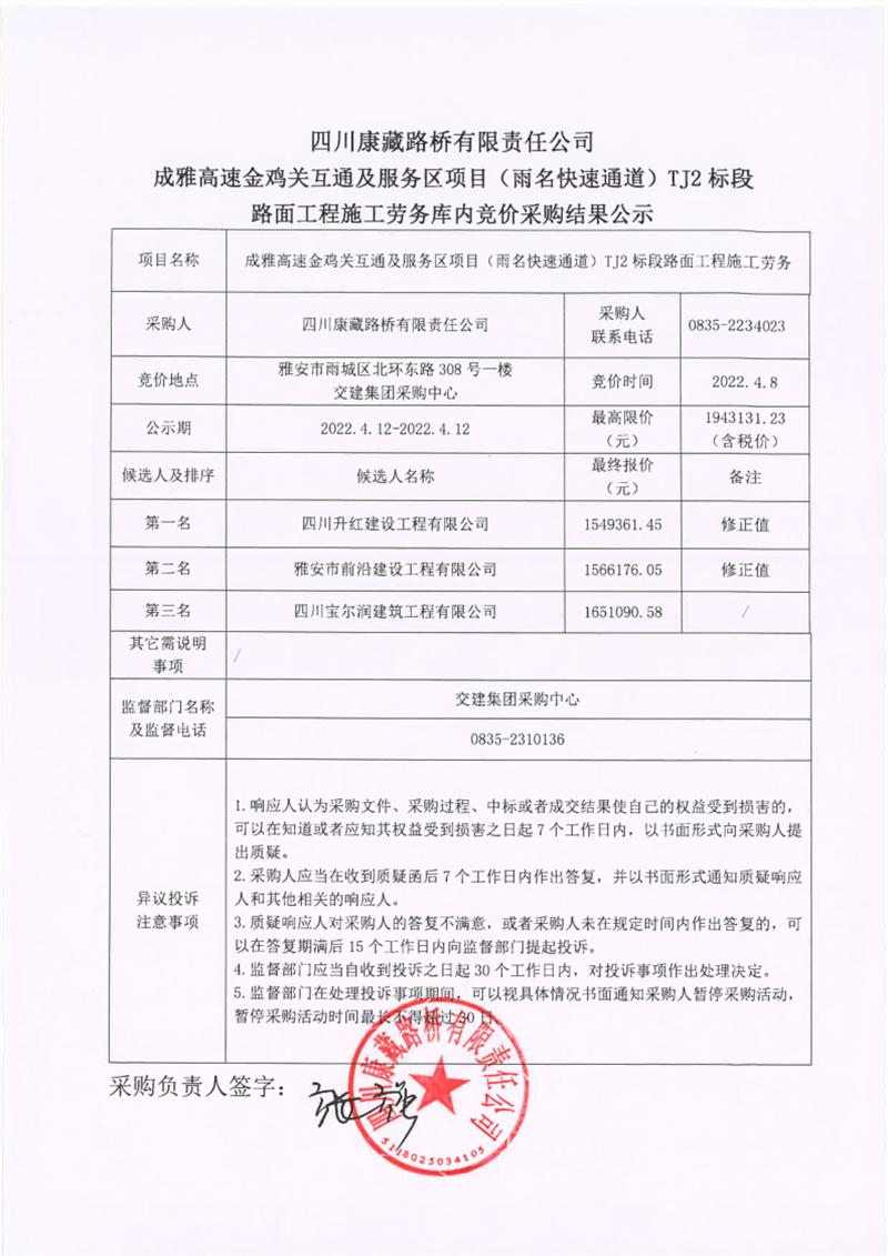 四川康藏路橋有限責(zé)任公司成雅高速金雞關(guān)互通及服務(wù)區(qū)項(xiàng)目(雨名快速通道)TJ2標(biāo)段路面工程施工勞務(wù)庫內(nèi)競價(jià)采購結(jié)果公示