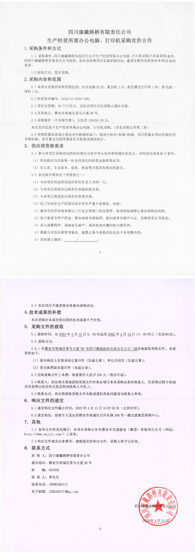 四川康藏路橋有限責(zé)任公司生產(chǎn)經(jīng)營(yíng)所需辦公電腦、打印機(jī)采購競(jìng)價(jià)公告