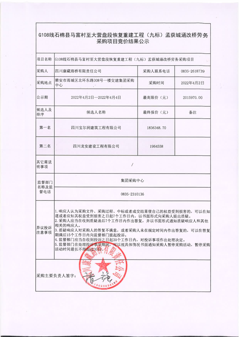 四川康藏路橋有限責(zé)任公司G108線石棉縣馬富村至大營(yíng)盤(pán)段恢復(fù)重建工程(九標(biāo))孟獲城涵改橋勞務(wù)采購(gòu)項(xiàng)目競(jìng)價(jià)結(jié)果公示