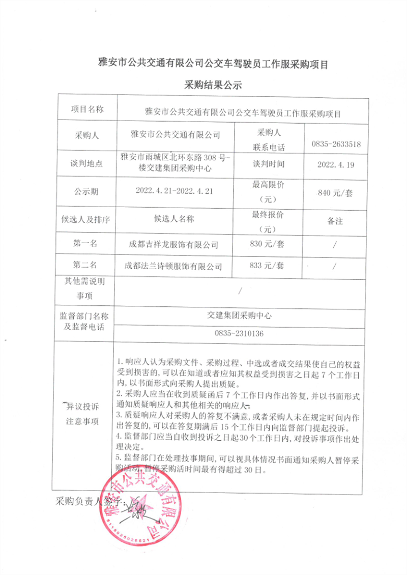 雅安市公共交通有限公司公交車駕駛員工作服采購項目采購結果公示