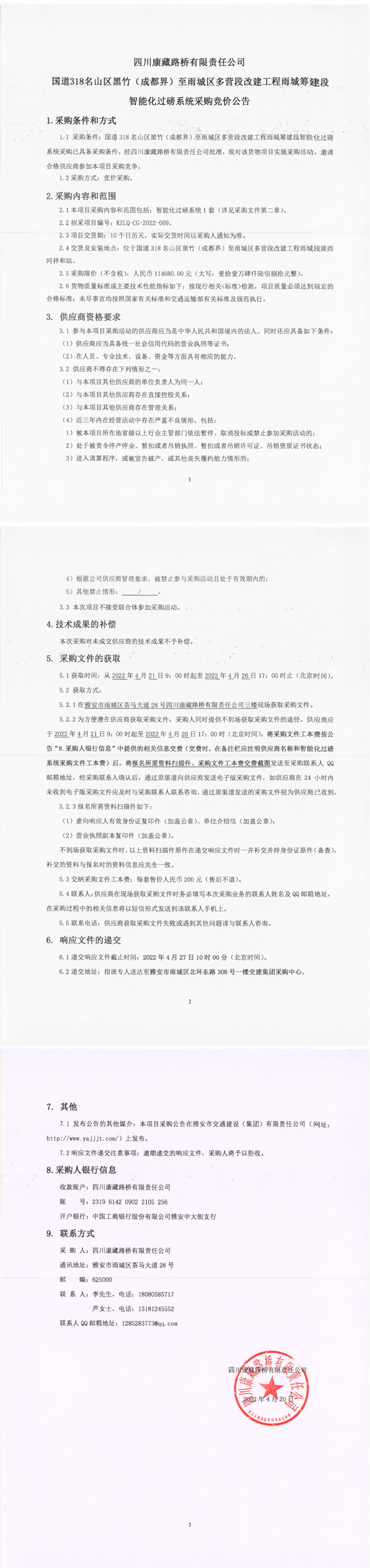 四川康藏路橋有限責(zé)任公司國(guó)道318名山區(qū)黑竹(成都界)至雨城區(qū)多營(yíng)段改建工程雨城籌建段智能化過磅系統(tǒng)采購(gòu)競(jìng)價(jià)公告