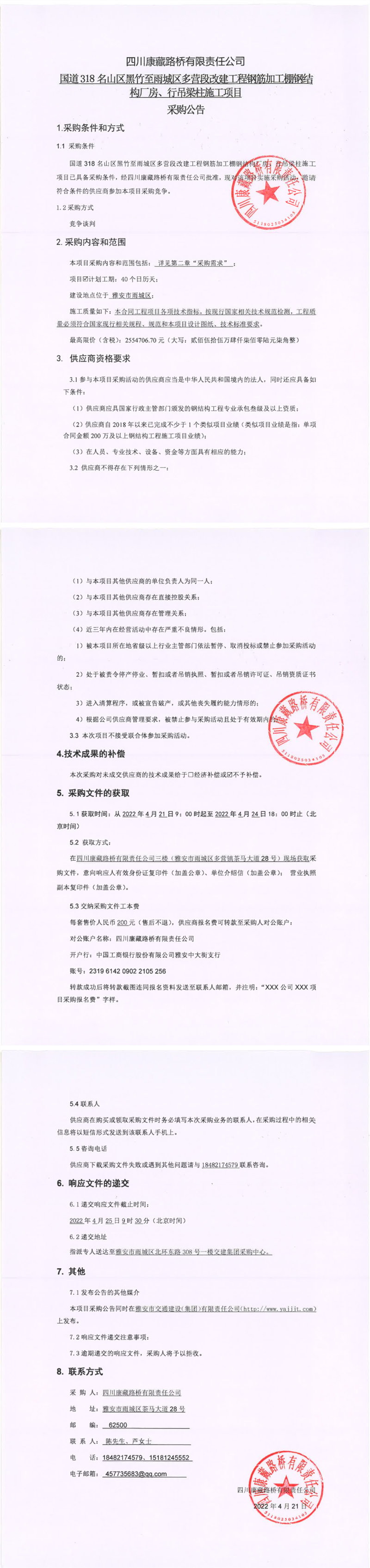 四川康藏路橋有限責(zé)任公司國(guó)道318名山區(qū)黑竹至雨城區(qū)多營(yíng)段改建工程鋼筋加工棚鋼結(jié)構(gòu)廠房、行吊梁柱施工項(xiàng)目采購(gòu)公告