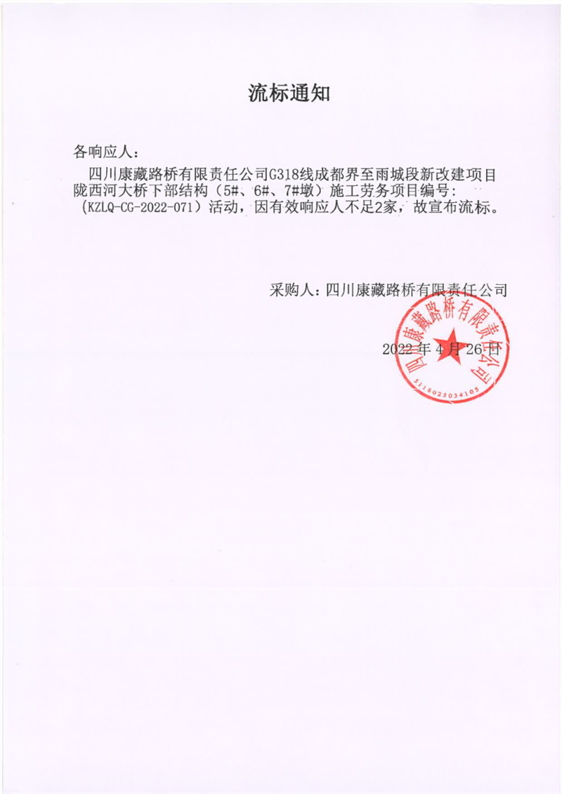 四川康藏路橋有限責(zé)任公司G318線成都界至雨城段新改建項目隴西河大橋下部結(jié)構(gòu)(5#、6#、7#墩)施工勞務(wù)采購流標(biāo)通知