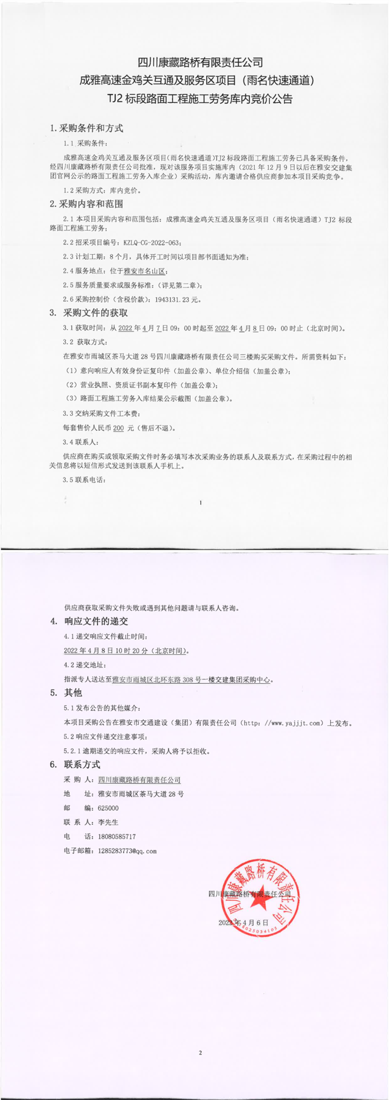 四川康藏路橋有限責(zé)任公司成雅高速金雞關(guān)互通及服務(wù)區(qū)項(xiàng)目(雨名快速通道)TJ2標(biāo)段路面工程施工勞務(wù)庫(kù)內(nèi)競(jìng)價(jià)公告