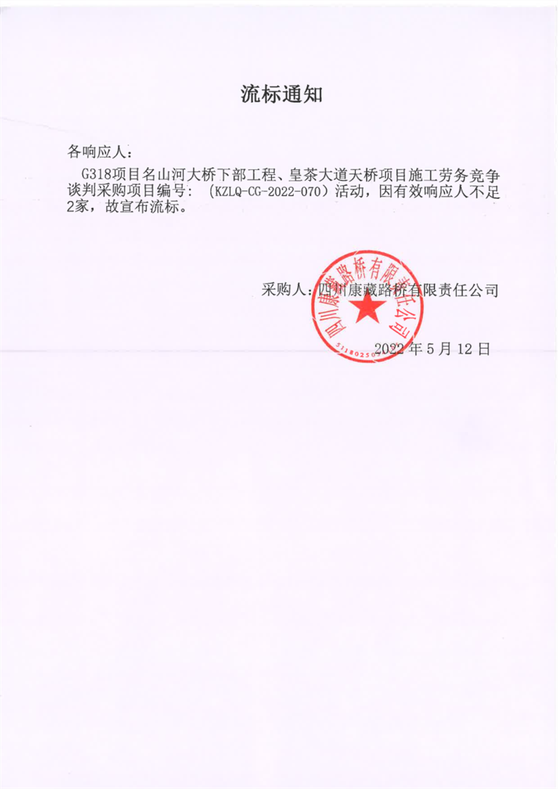 四川康藏路橋有限責(zé)任公司G318項目名山河大橋下部工程、皇茶大道天橋項目施工勞務(wù)談判采購項目流標(biāo)通知
