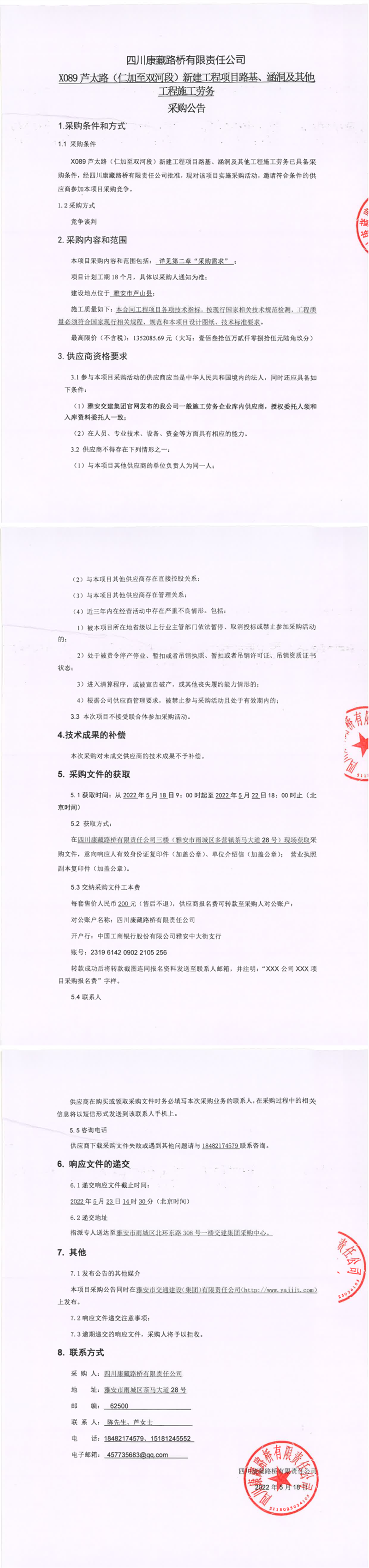 四川康藏路橋有限責任公司X089蘆太路(仁加至雙河段)新建工程項目路基、涵洞及其他工程施工勞務(wù)采購公告