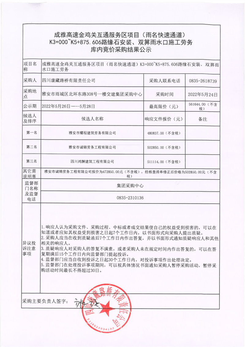 四川康藏路橋有限責(zé)任公司成雅高速金雞關(guān)互通服務(wù)區(qū)項(xiàng)目(雨名快速通道)K3+000~K5+875.606路緣石安裝、雙箅雨水口施工勞務(wù)庫內(nèi)競價(jià)采購結(jié)果公示