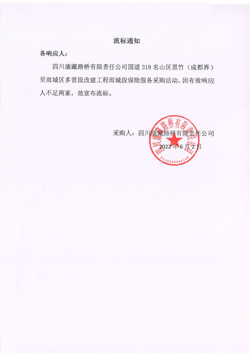 四川康藏路橋有限責(zé)任公司國(guó)道318名山區(qū)黑竹(成都界)至雨城區(qū)多營(yíng)段改建工程雨城段保險(xiǎn)服務(wù)采購(gòu)流標(biāo)通知