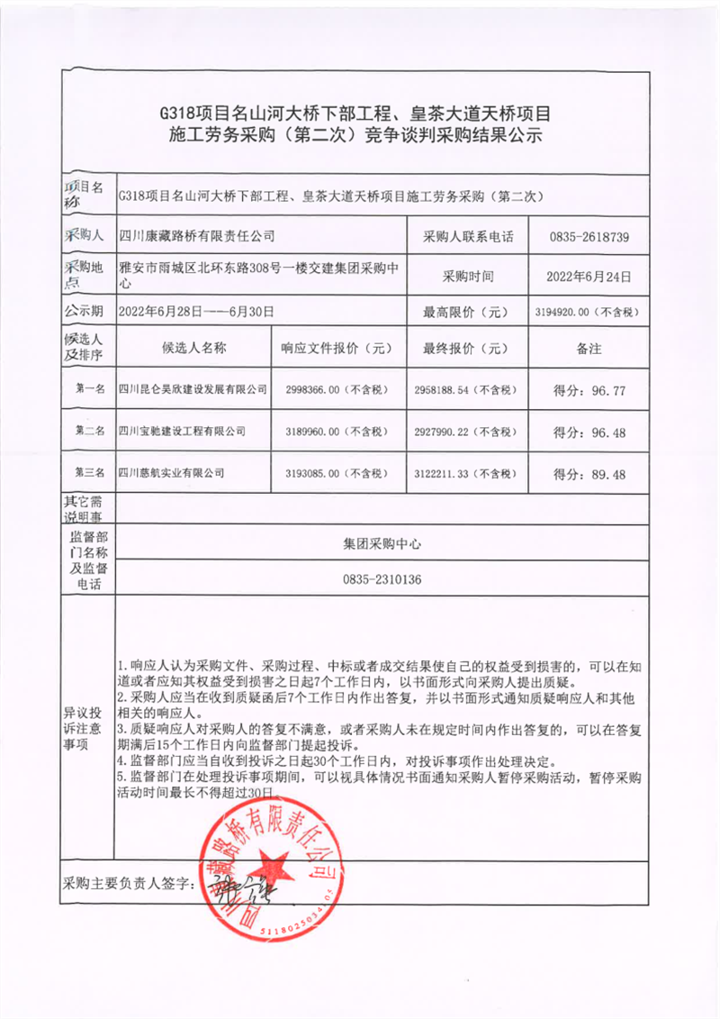 四川康藏路橋有限責任公司G318項目名山河大橋下部工程、皇茶大道天橋項目施工勞務采購(第二次)競爭談判采購結果公示