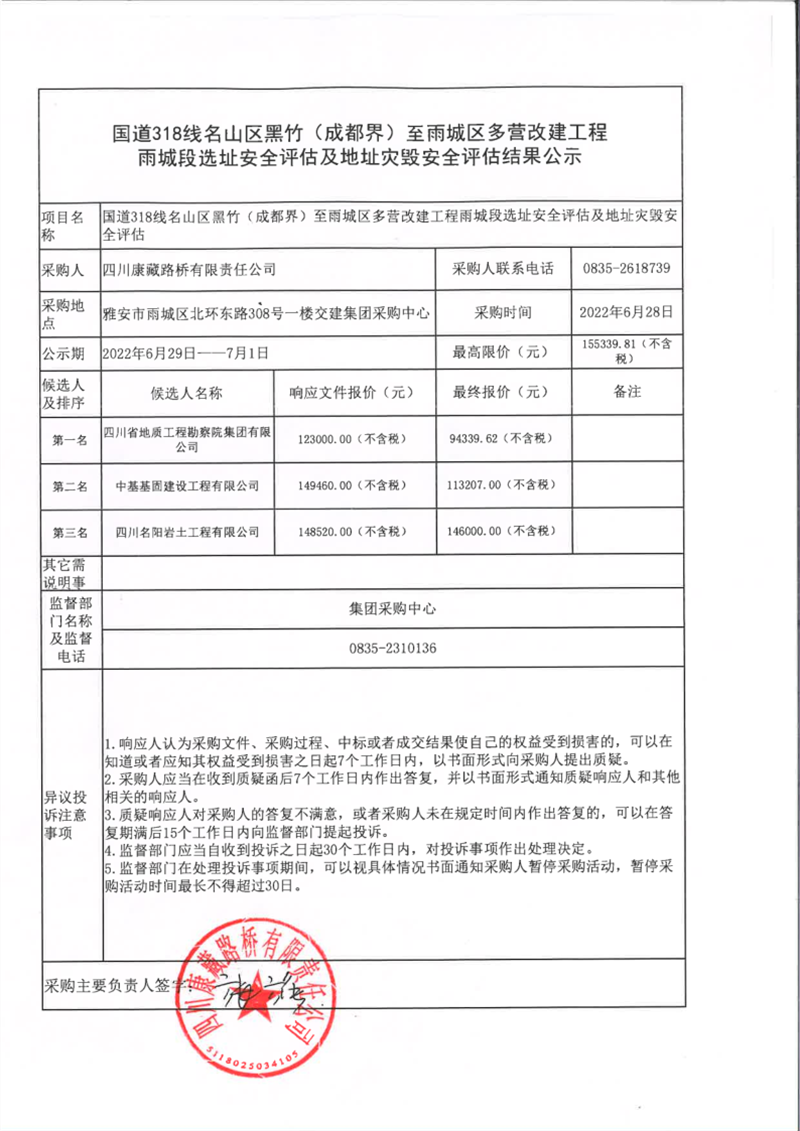 四川康藏路橋有限責(zé)任公司國道318名山區(qū)黑竹(成都界)至雨城區(qū)多營段改建工程雨城段選址安全評(píng)估及地址災(zāi)毀安全評(píng)估結(jié)果公示
