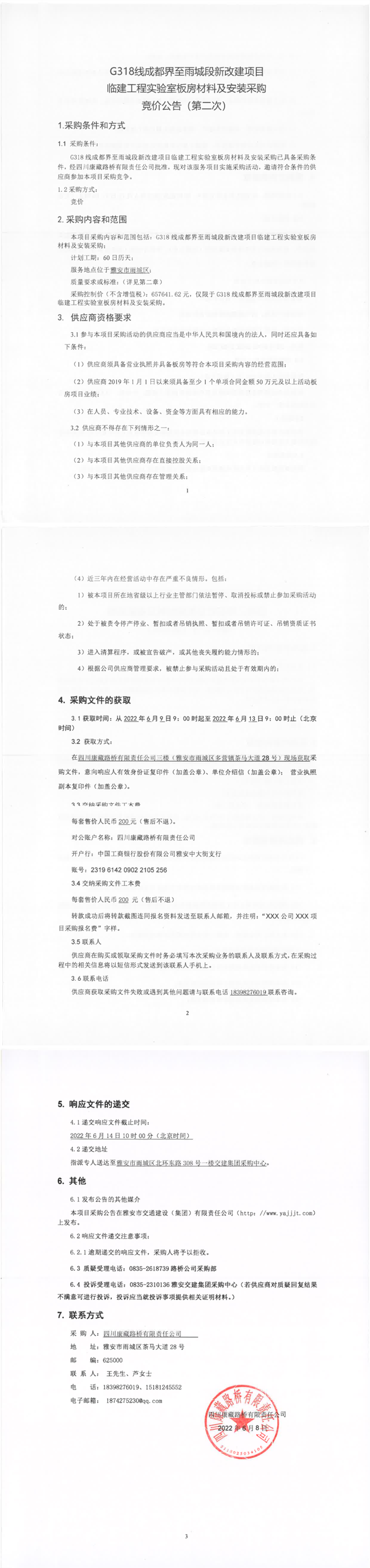 四川康藏路橋有限責(zé)任公司G318線成都界至雨城段新改建項(xiàng)目臨建工程實(shí)驗(yàn)室板房材料及安裝采購(gòu)競(jìng)價(jià)公告(第二次)