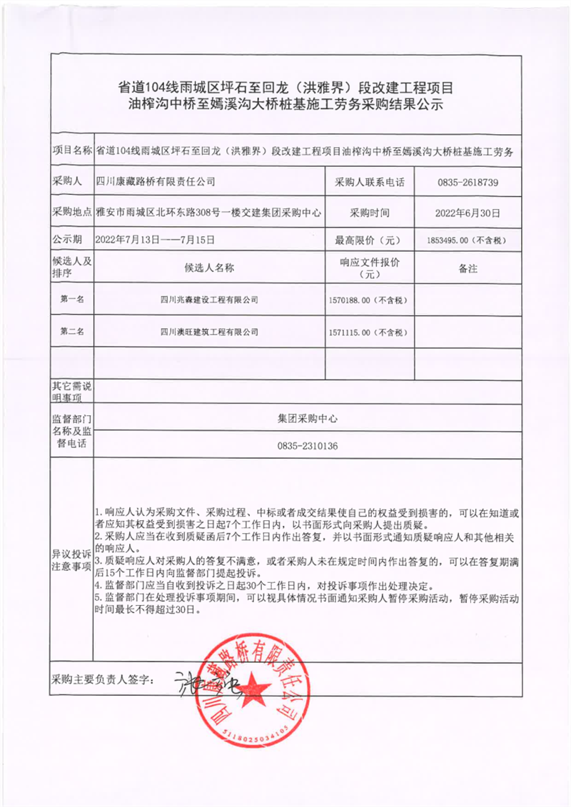 四川康藏路橋有限責(zé)任公司省道104線雨城區(qū)坪石至回龍(洪雅界)段改建工程項目油榨溝中橋至嫣溪溝大橋樁基施工勞務(wù)采購結(jié)果公示