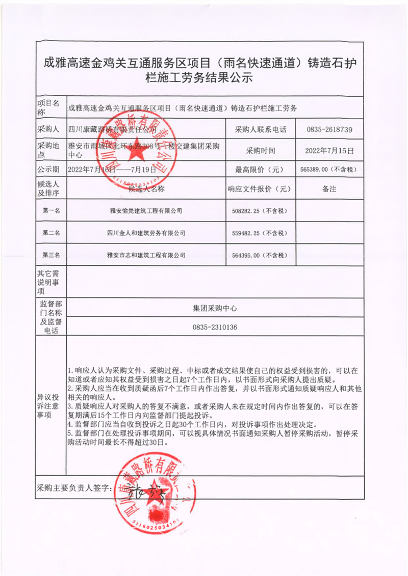 四川康藏路橋有限責(zé)任公司成雅高速金雞關(guān)互通服務(wù)區(qū)項(xiàng)目(雨名快速通道)鑄造石護(hù)欄工程施工勞務(wù)結(jié)果公示