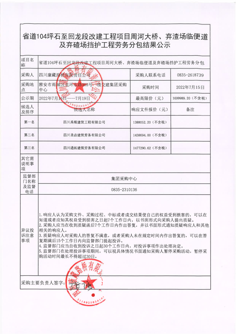 四川康藏路橋有限責任公司省道104坪石至回龍段改建工程項目周河大橋、棄渣場臨便道及棄碴場擋護工程勞務分包結果公示