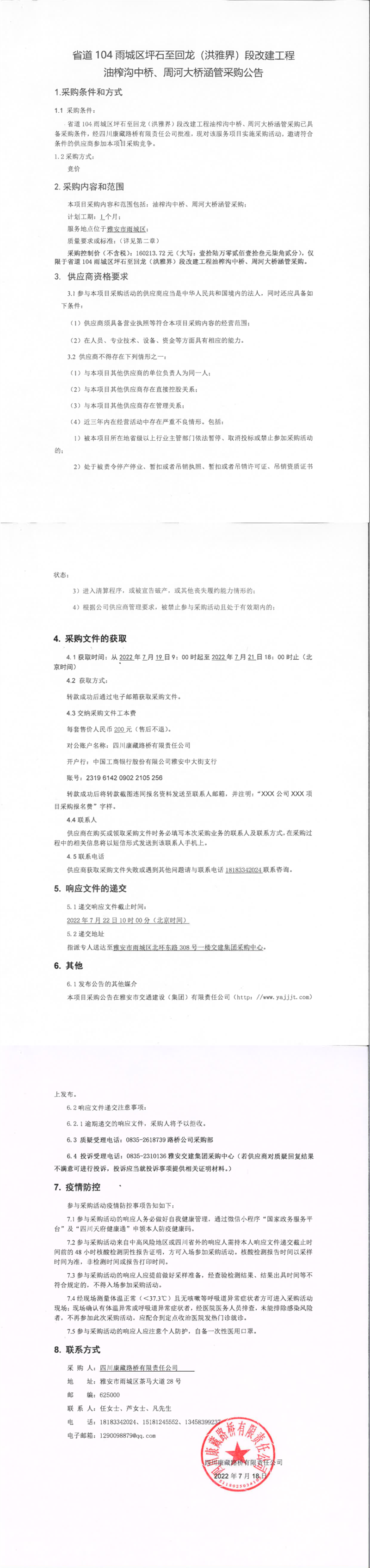 四川康藏路橋有限責(zé)任公司省道104雨城區(qū)坪石至回龍(洪雅界)段改建工程油榨溝中橋、周河大橋涵管采購公告
