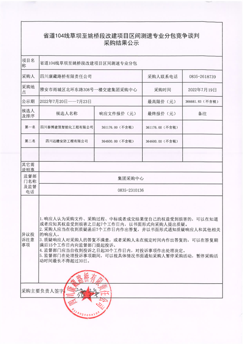 四川康藏路橋有限責(zé)任公司省道104線草壩至姚橋段改建項(xiàng)目區(qū)間測(cè)速專業(yè)分包競(jìng)爭(zhēng)談判采購結(jié)果公示