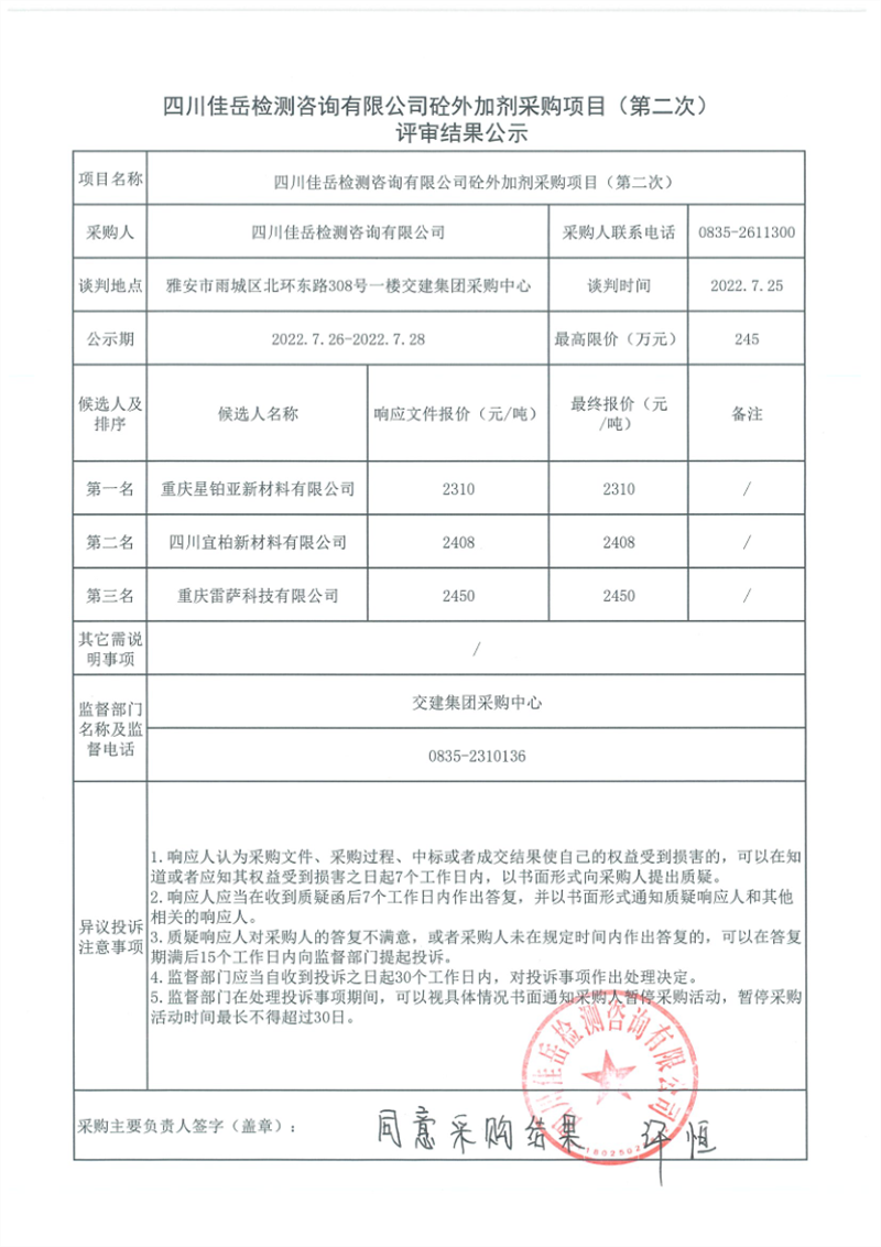 四川佳岳檢測咨詢有限公司砼外加劑采購項(xiàng)目(第二次)評(píng)審結(jié)果公示