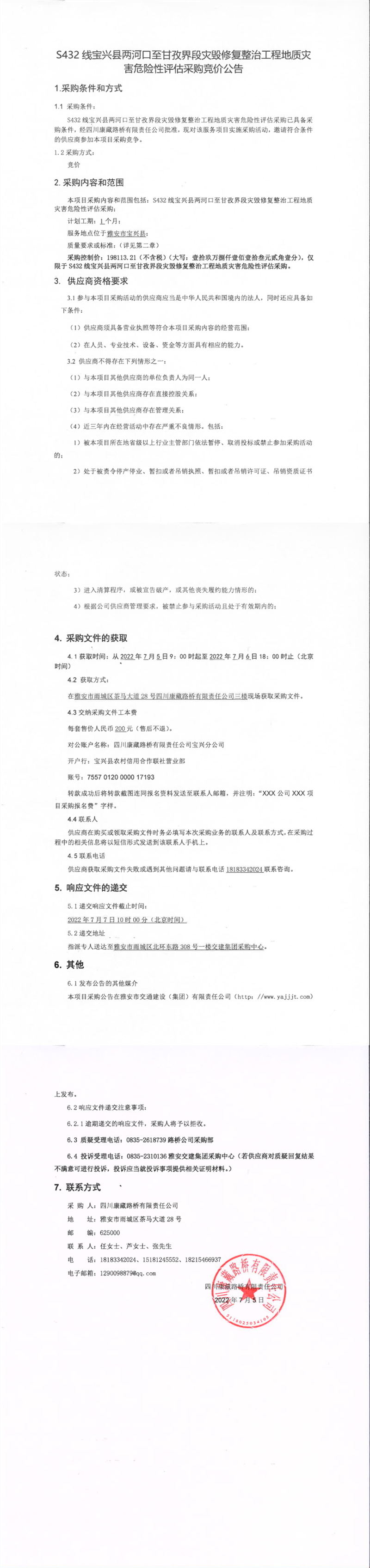 四川康藏路橋有限責(zé)任公司S432線寶興縣兩河口至甘孜界段災(zāi)毀修復(fù)整治工程地質(zhì)災(zāi)害危險(xiǎn)性評(píng)估采購競(jìng)價(jià)公告