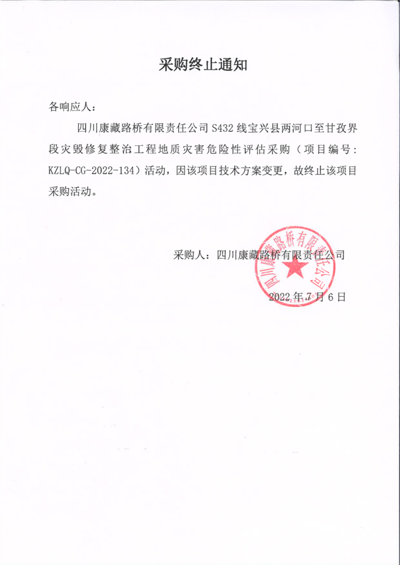 四川康藏路橋有限責任公司S432線寶興縣兩河口至甘孜界段災毀修復整治工程地質(zhì)災害危險性評估采購終止通知