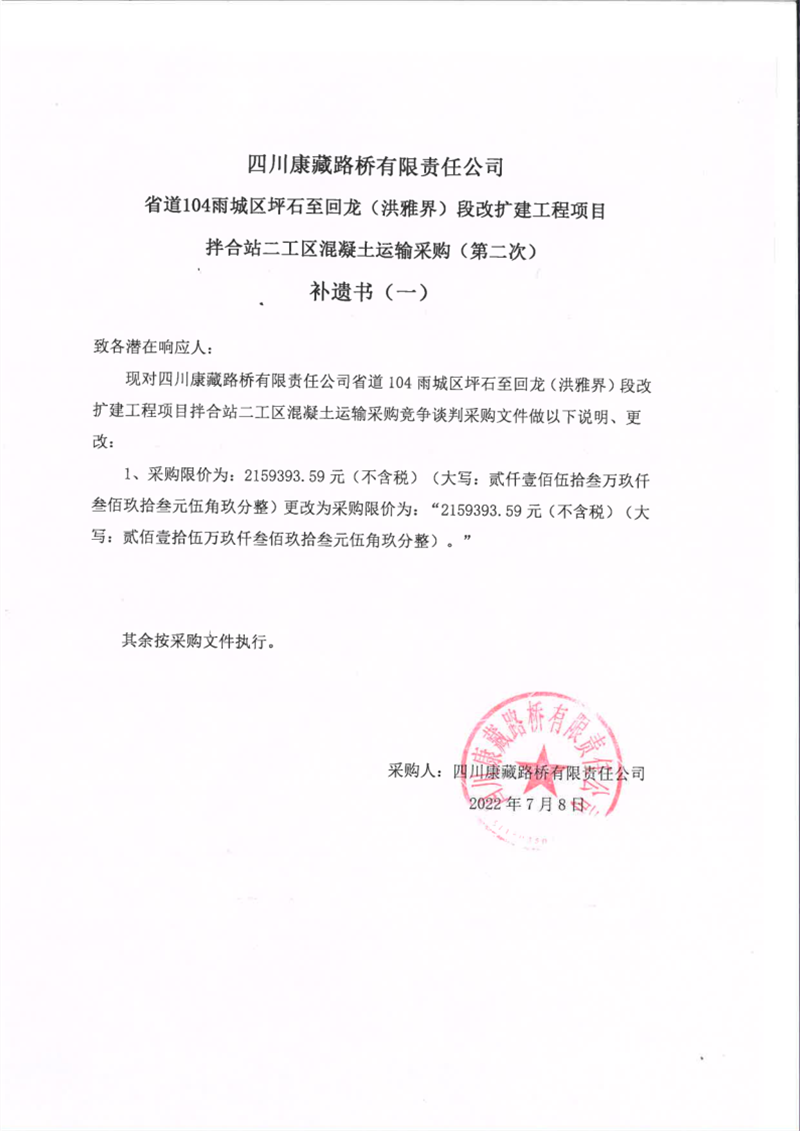 四川康藏路橋有限責(zé)任公司省道104線雨城區(qū)坪石至回龍(洪雅界)段改建工程項目拌合站二工區(qū)混凝土運(yùn)輸采購(第二次)補(bǔ)遺書(一)