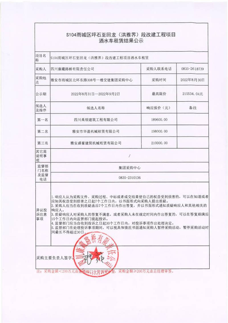 四川康藏路橋有限責(zé)任公司S104雨城區(qū)坪石至回龍(洪雅界)段改建工程項(xiàng)目灑水車(chē)租賃結(jié)果公示