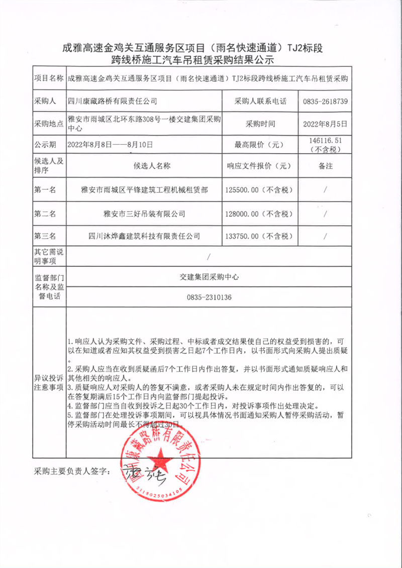 四川康藏路橋有限責(zé)任公司成雅高速金雞關(guān)互通服務(wù)區(qū)項(xiàng)目(雨名快速通道)TJ2標(biāo)段跨線橋施工汽車吊租賃采購(gòu)結(jié)果公示