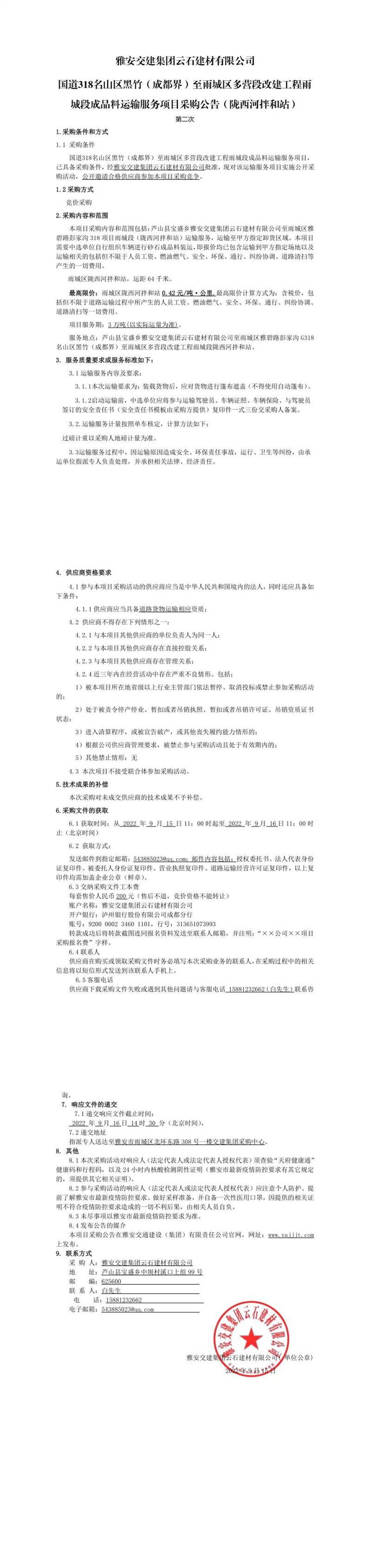 雅安交建集團(tuán)云石建材有限公司國道318名山區(qū)黑竹(成都界)至雨城區(qū)多營段改建工程名山段成品料運(yùn)輸服務(wù)項(xiàng)目采購公告(皇茶大道拌和站)