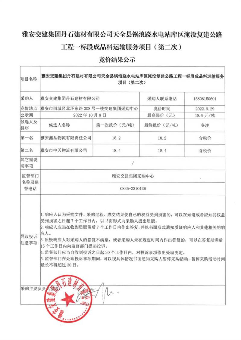雅安交建集團丹石建材有限公司天全縣鍋浪蹺水電站庫區(qū)淹沒復建公路工程一標段成品料運輸服務項目(第二次)競價結果公示
