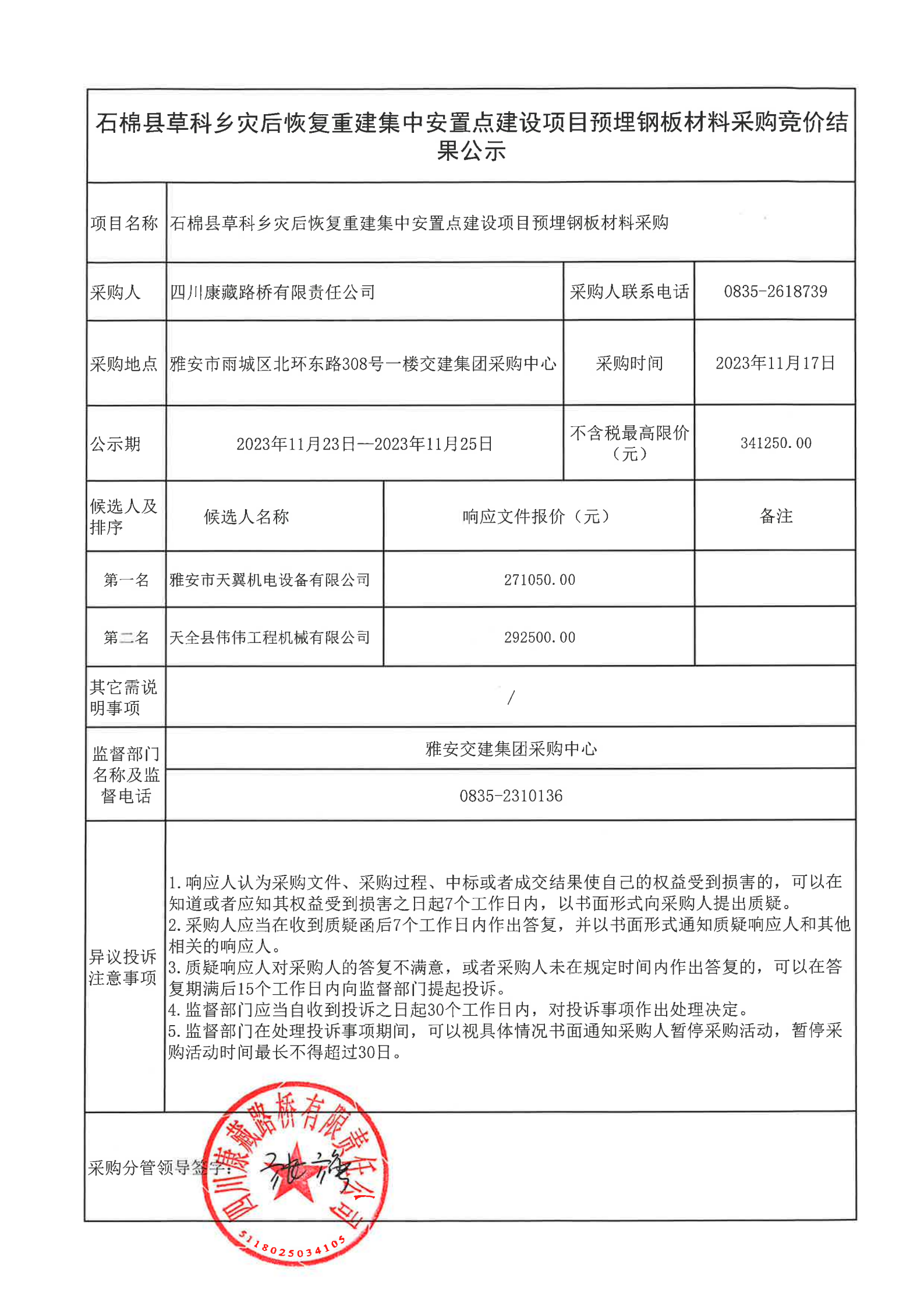 四川康藏路橋有限責(zé)任公司石棉縣草科鄉(xiāng)災(zāi)后恢復(fù)重建集中安置點(diǎn)建設(shè)項(xiàng)目預(yù)埋鋼板材料采購結(jié)果公示
