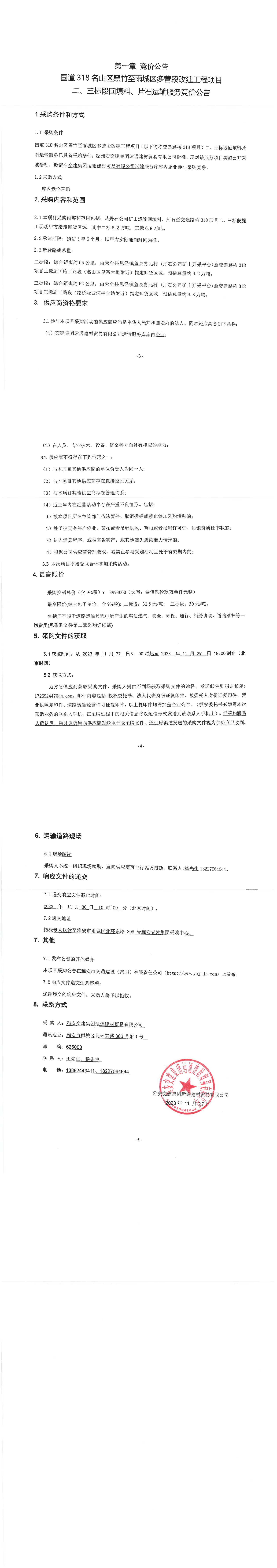 交建集團(tuán)運通建材貿(mào)易有限公司國道318名山區(qū)黑竹至雨城區(qū)多營段改建工程項目二、三標(biāo)段回填料、片石運輸服務(wù)競價公告