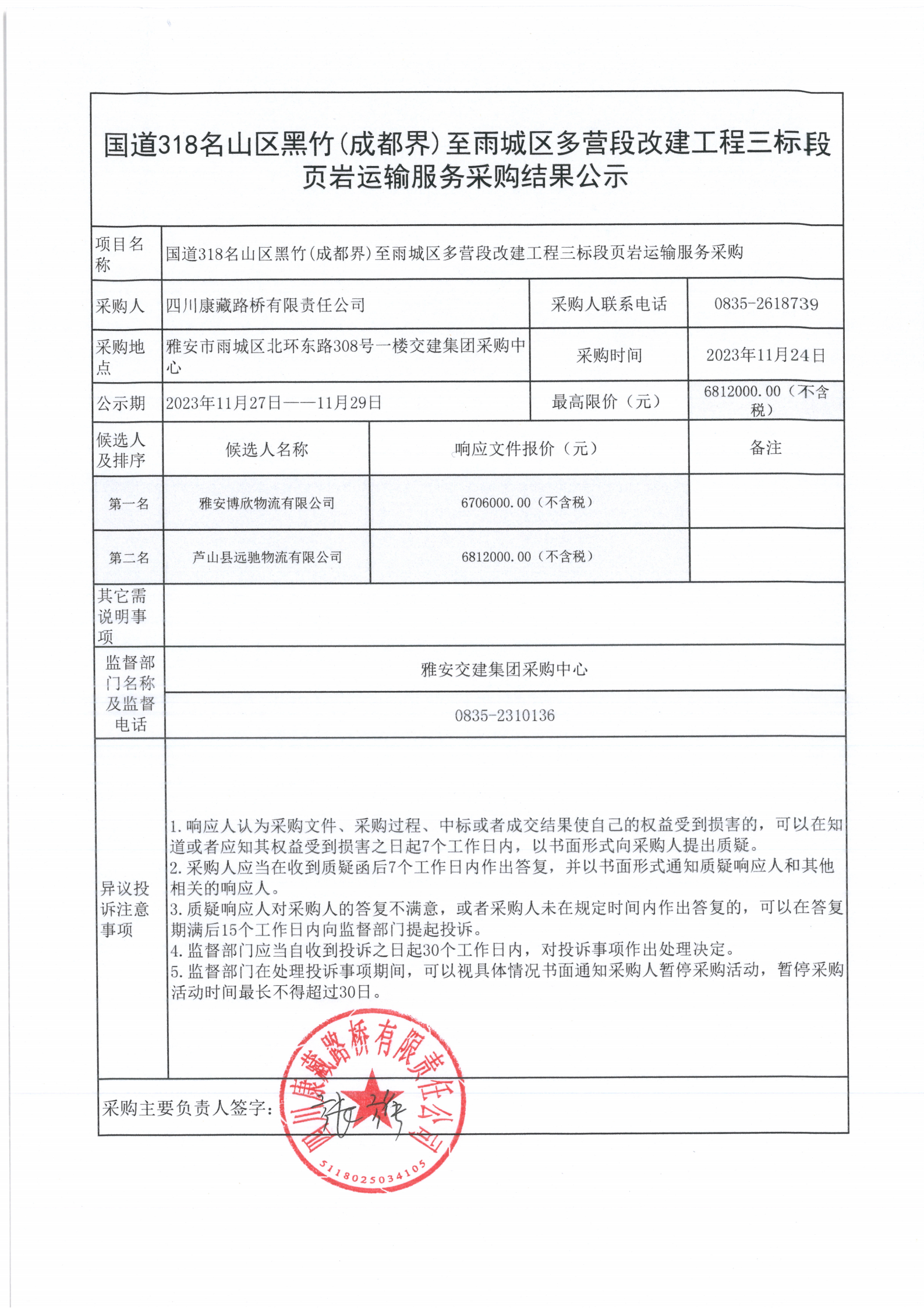 四川康藏路橋有限責(zé)任公司國道318名山區(qū)黑竹(成都界)至雨城區(qū)多營段改建工程三標段頁巖運輸服務(wù)采購結(jié)果公示