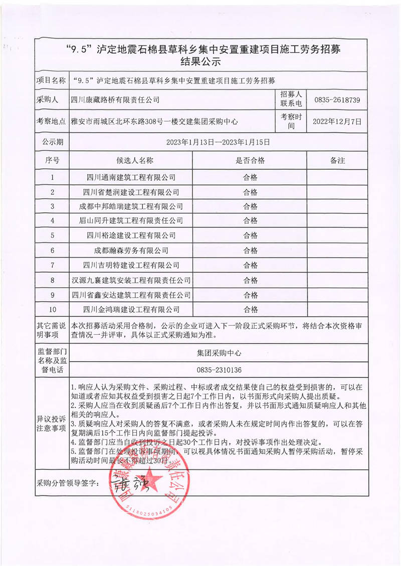 四川康藏路橋有限責任公司“9.5”瀘定地震石棉縣草科鄉(xiāng)集中安置重建項目施工勞務(wù)招募結(jié)果公示